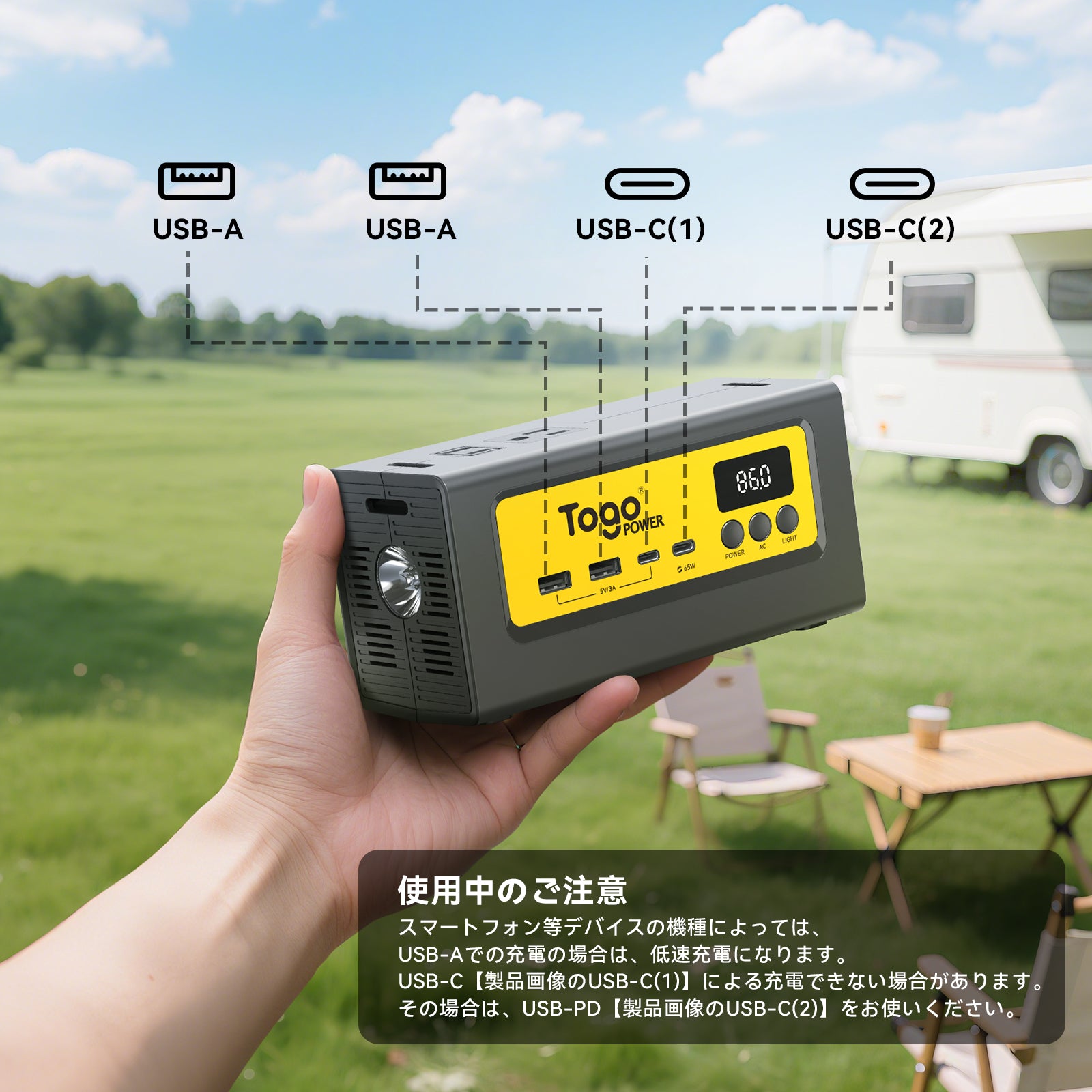 【USBの使用】スマートフォン等デバイスの機種によっては、USB-Aでの充電の場合は、低速充電になります。USB-C【製品画像のUSB-C(1)】による充電できない場合があります。その場合は、USB―PD【製品画像のUSB-C(2)】をお使いください。