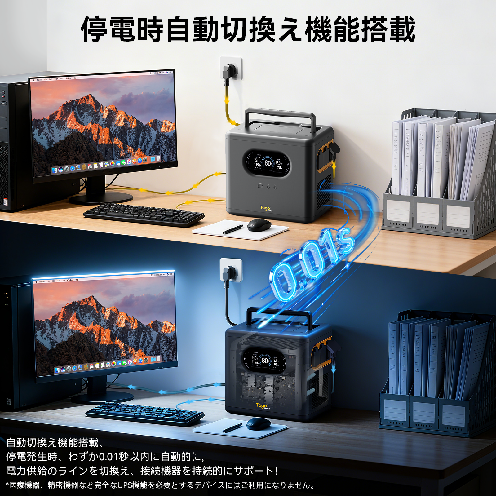【停電時自動切換え機能搭載】停電発生時、わずか0.01秒以内に自動的に電力供給のラインを切換え、接続機器を継続的にサポートします。
